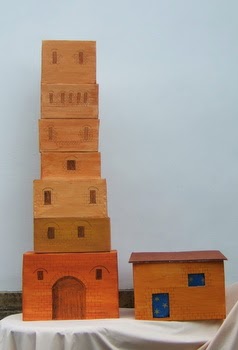Children with the boxes build the tower